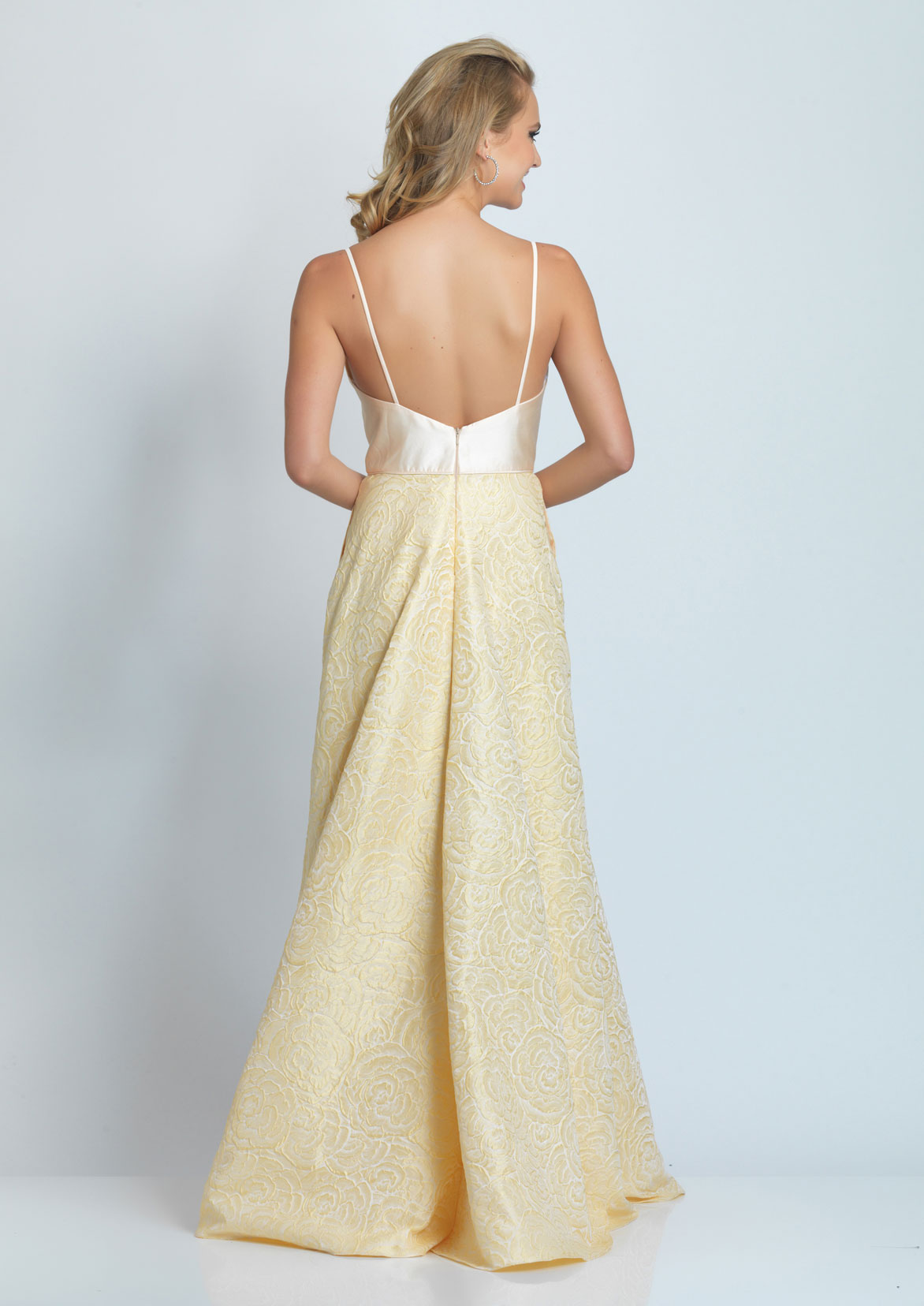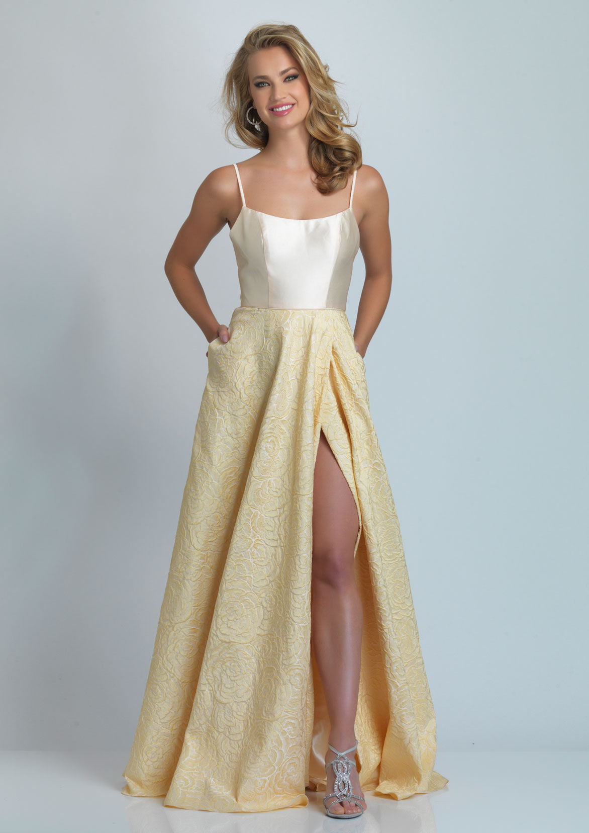 Dave and Johnny Prom Dress A8636. A floral brocade gown featuring a slit, pockets and a satin top.