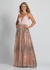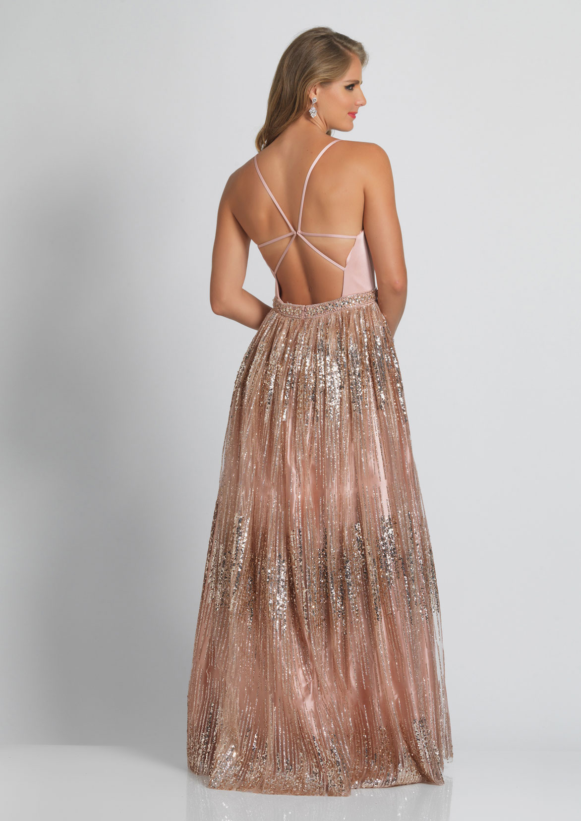 Dave and Johnny Prom Dress A8749. Made in satin fabric, the fitted bodice features a plunging V neckline with sheer inset detail at the bust, supported with spaghetti straps which criss cross the open back. Styled in glitter tulle, the a-line skirt adorns soft pleats that falls to a full length hemline.As advertised from the manufacturer: www.Daveandjohnny.com.