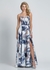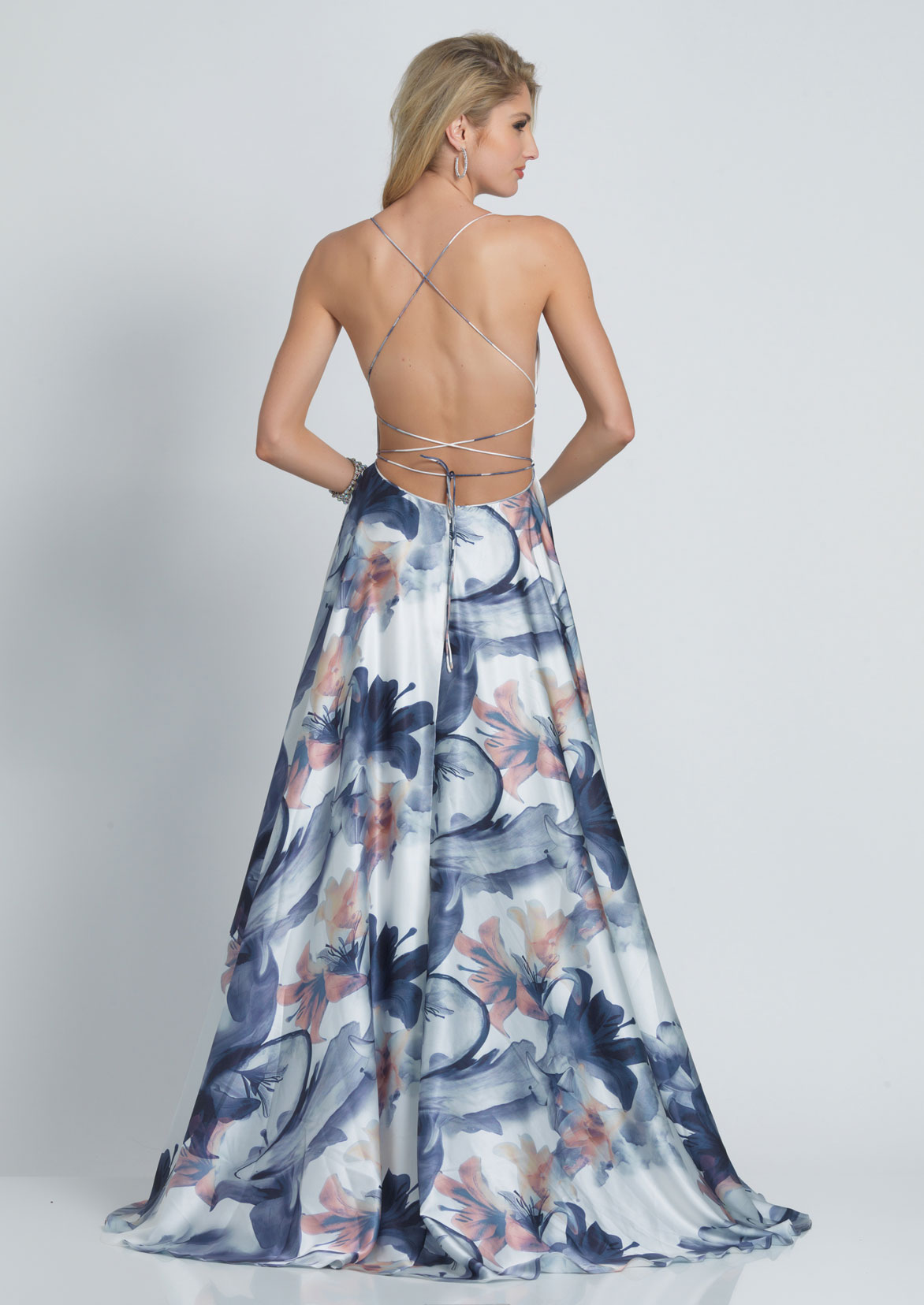 Dave and Johnny Prom Dress A8755. A floral A-line gown featuring a slit, a straight neckline, and an open tie-up back.