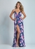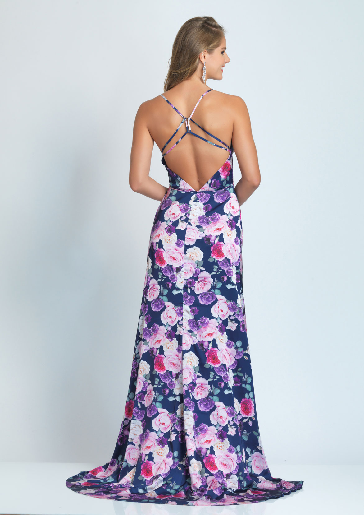 Dave and Johnny Prom Dress A8981. A floral wrap up dress with a V-neckline and a slit.