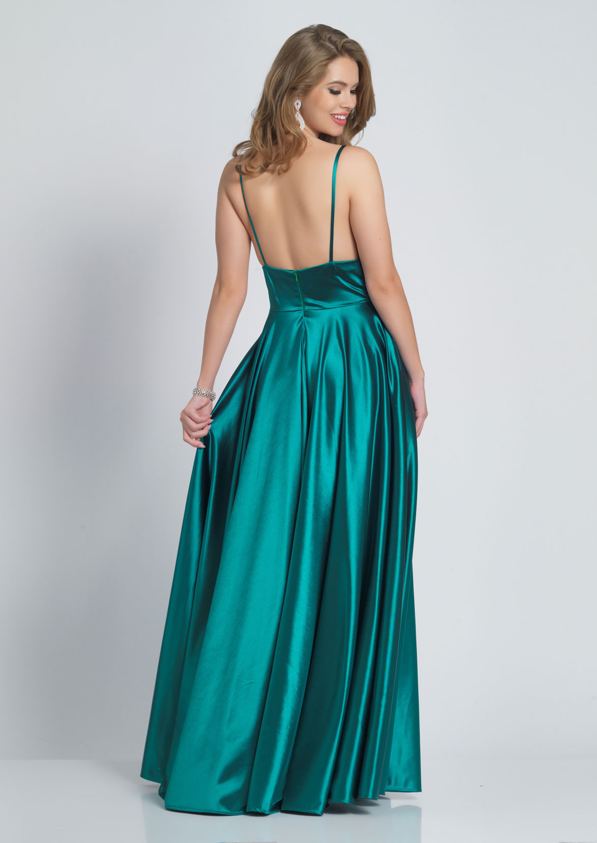 Dave and Johnny Prom Dress A8994. A shiny A-line gown with pockets and a V-neckline.