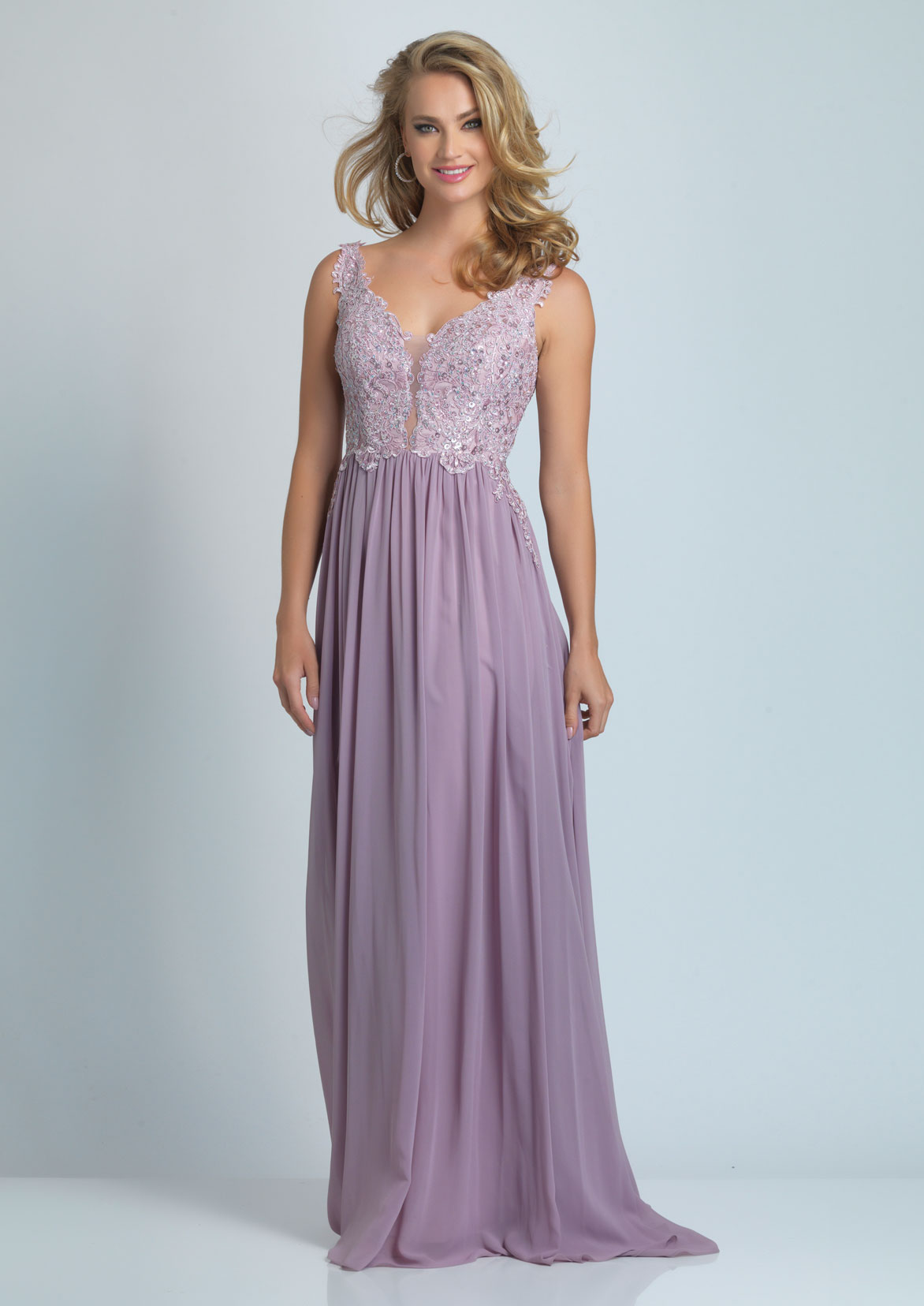Dave and Johnny Prom Dress A9013. A chiffon gown featuring a lace top.
