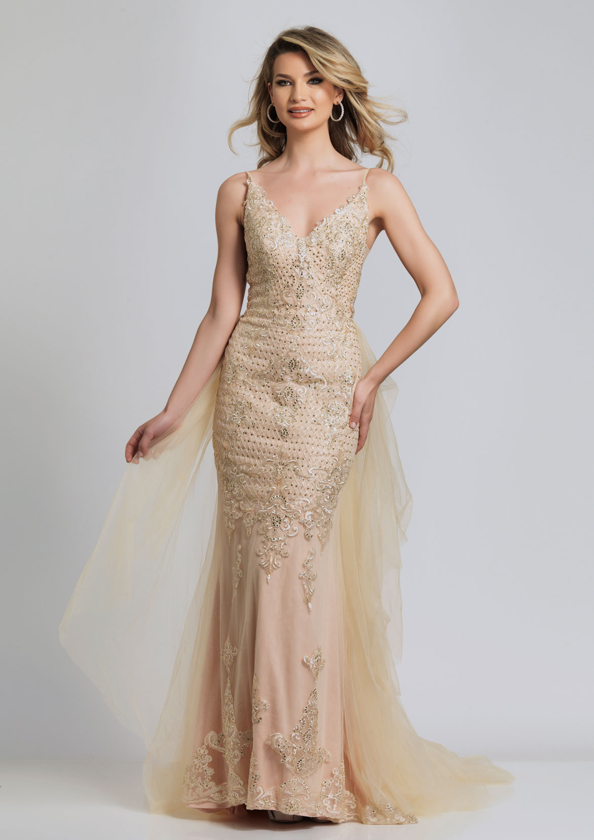 Dave and Johnny Prom Dress A9030. A lace mermaid dress with a tulle overlay skirt.