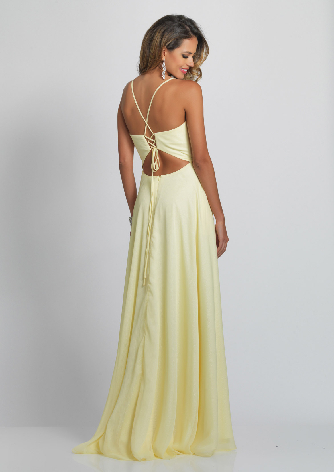 Dave and Johnny Prom Dress A9351. A chiffon A-line gown with a plunging V-neckline, a lace up back, a high skirt slit.